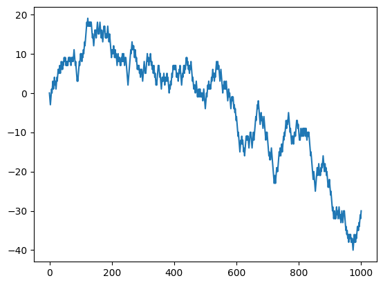mport matplotlib.pyplot as plt # Number of steps in the random walk num_steps = 1000 # Starting position position = 0 positions = [position] # Generate the random walk for i in range(num_steps): step = random.choice([-1, 1]) position += step positions.append(position) plt.plot(positions) plt.show()