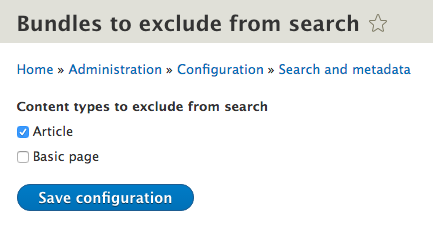 Why are we using configuration? Because our settings page contains checkboxes, allowing users to customize which content types should be excluded from search. These settings are placed into a configuration instead of a plain variable, meaning they can be exported/imported as code. It also means we can set defaults in code. If we wanted to ship our module with the default of "exclude Articles from search, but show Basic Page content in search results" you would add this file: